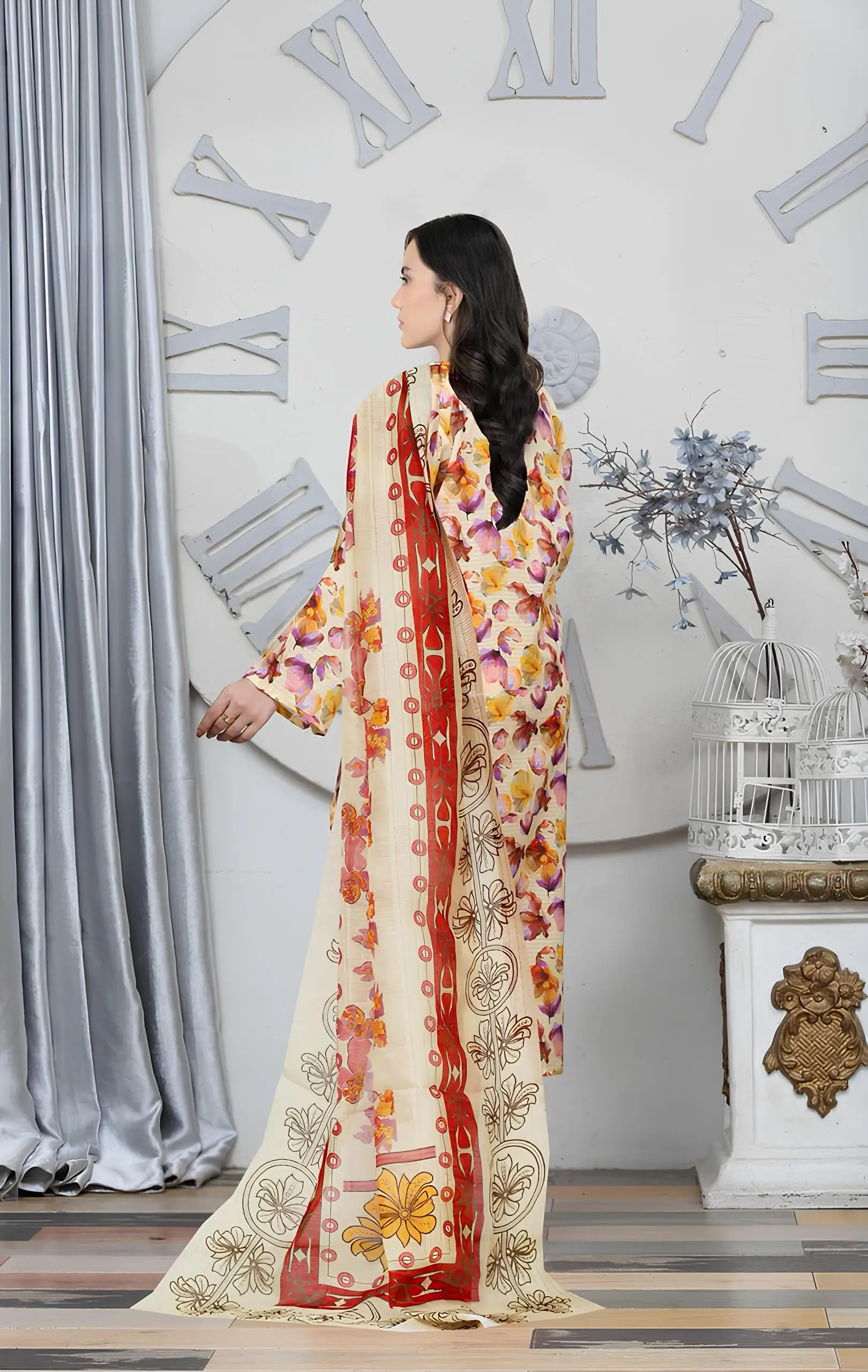 & Free Delivery NationwideTurn heads with this eye-catching multi-colored floral suit, bursting with vibrant hues of orange, pink, purple, and yellow. The breezy Cotton shirt and trousers are printed with painterly petals that evoke a lively, energetic charm. A cream Bana Doria dupatta adds elegance, detailed with sketched floral outlines, bright border accents, and pops of orange and red for a striking contrast. Perfect for spring gatherings or casual festive wear.