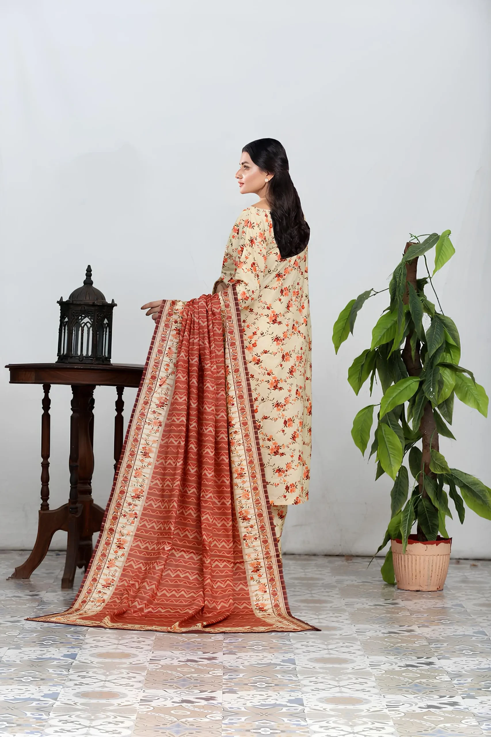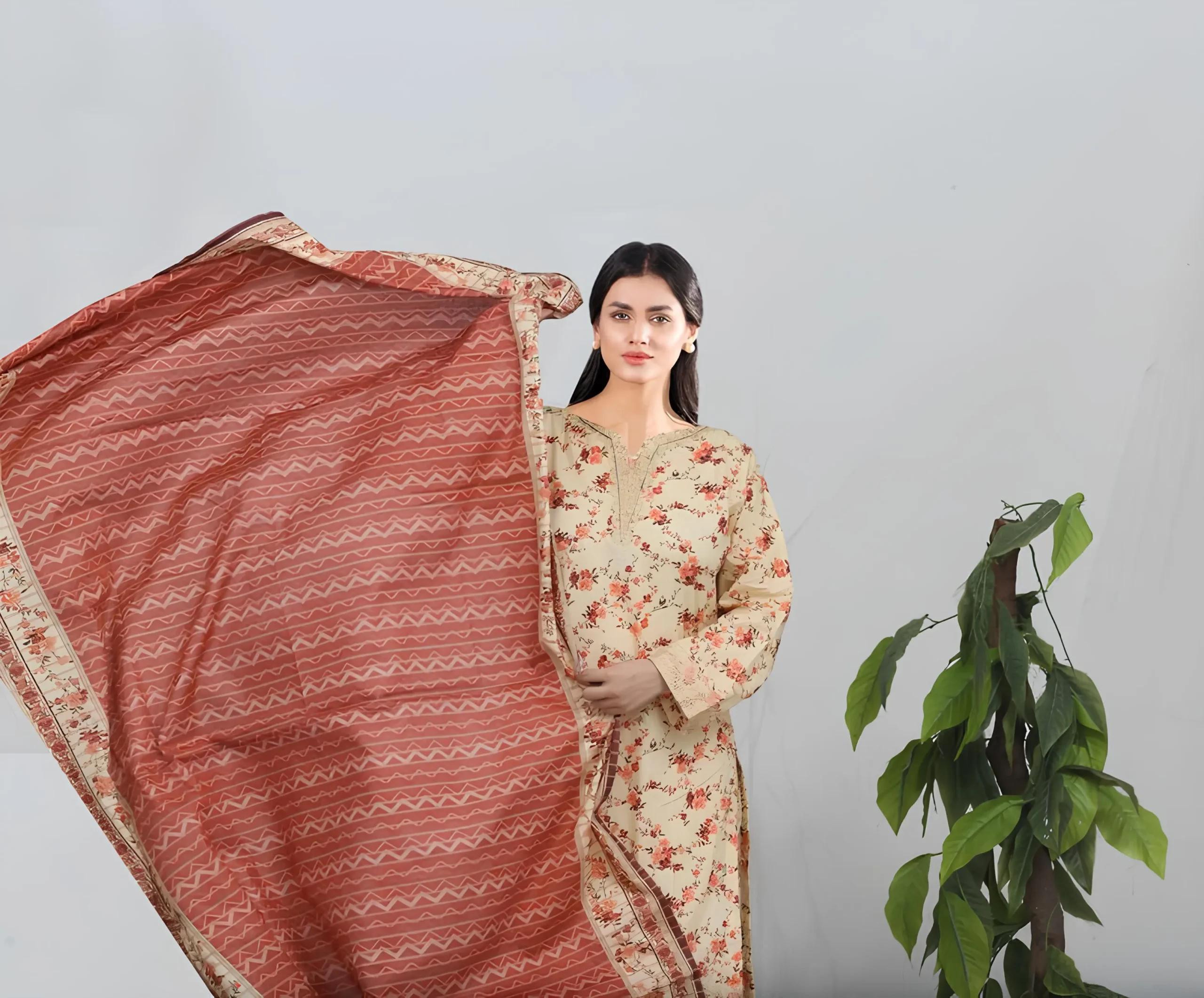 & Free Delivery NationwideInfuse your wardrobe with warmth and elegance through this cream-colored printed suit set adorned with orange and red floral vines. The shirt features intricate embroidery along the Neck, Daman & Sleeves, lending a touch of refinement. Paired with matching trousers and a rich rust-toned dupatta decorated with ethnic patterns and floral borders, this ensemble strikes a graceful balance between tradition and sophistication—perfect for formal lunches or festive daytime occasions.
